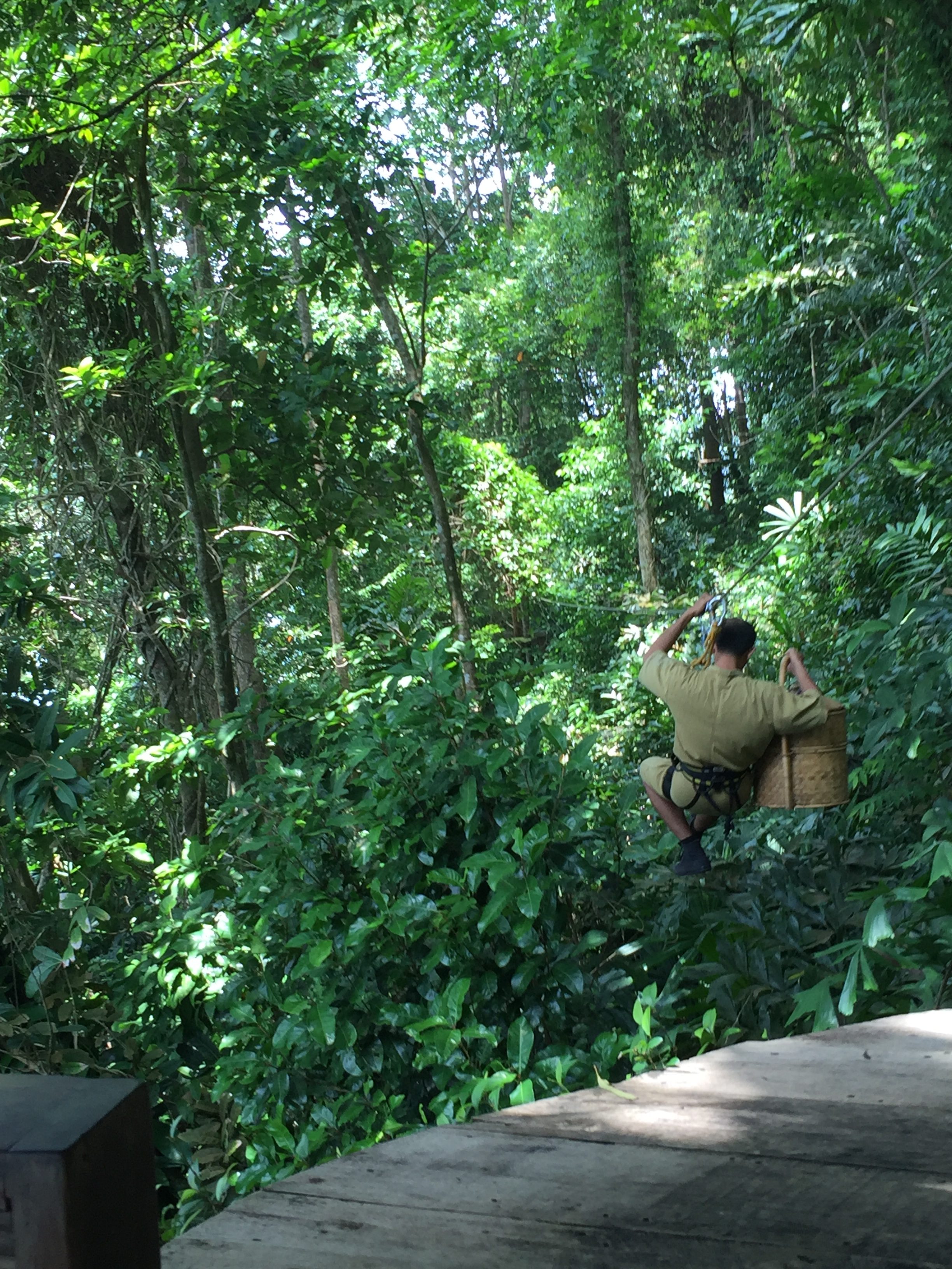 料理は美味しいですがとにかく量が多いです。半分も食べられませんでした。前菜が終わるといよいよメインイベントです。ターザンです。木と木の間に張られたロープにぶら下がって去っていきます。しばらくするとメイン料理の入った籠をもって戻ってきます。とうぜんですが、行きと帰りは違うロープを使います。ではご覧ください。